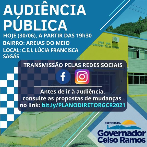 A Prefeitura de Governador Celso Ramos, por meio da Secretaria de Planejamento e da Procuradoria Municipal, realiza nesta segunda-feira (30/06) uma das 12 audiências públicas para discutir com a população o tema “Alteração do Plano Diretor – Criação e alteração de zoneamento no território de Governador Celso Ramos”.